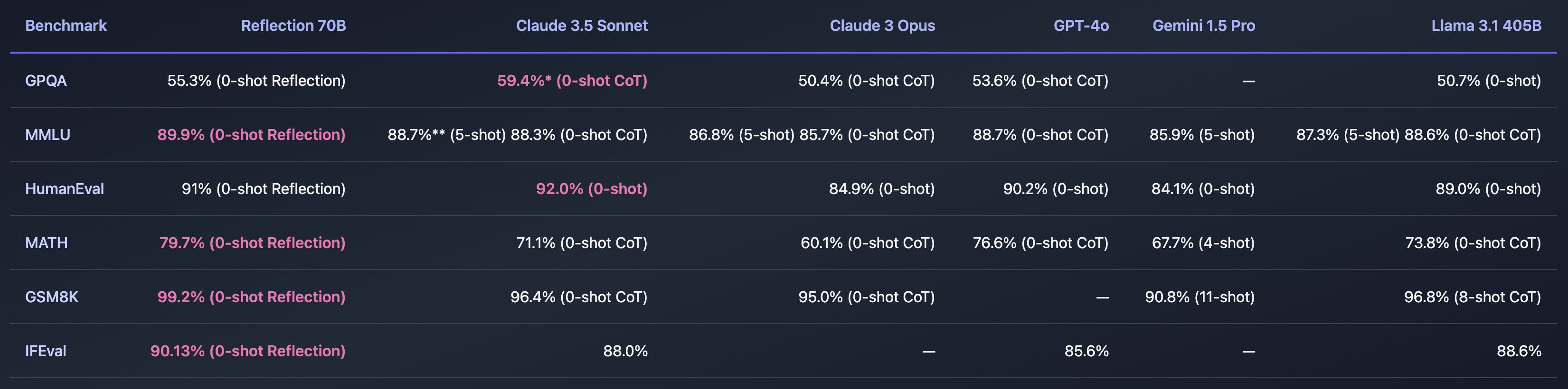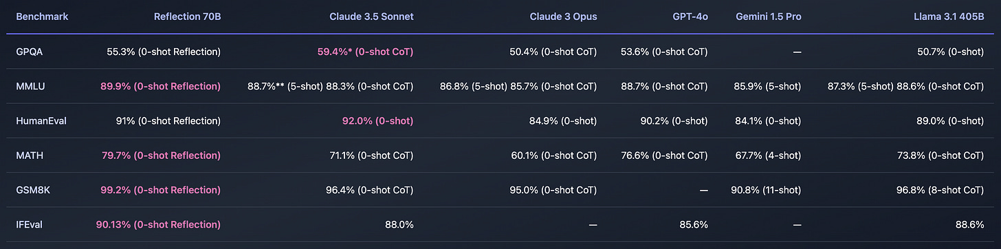 (Note that these comparisons are a bit of a apples to ... different types of apples. If you apply CoT and reflection to the Claude 3.5 model, they may in fact perform better on the above, as this won't be counted 0-shot anymore. But given that this new model is effectively spitting out those reflection tokens, I'm ok with this comparison)