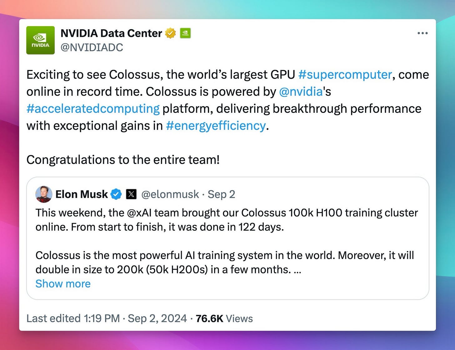 X ai scaled Colossus to 100K H100 GPU goes online (X)