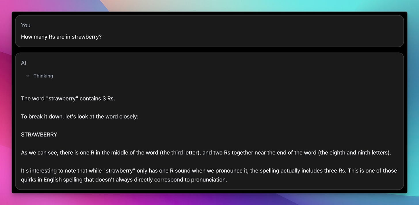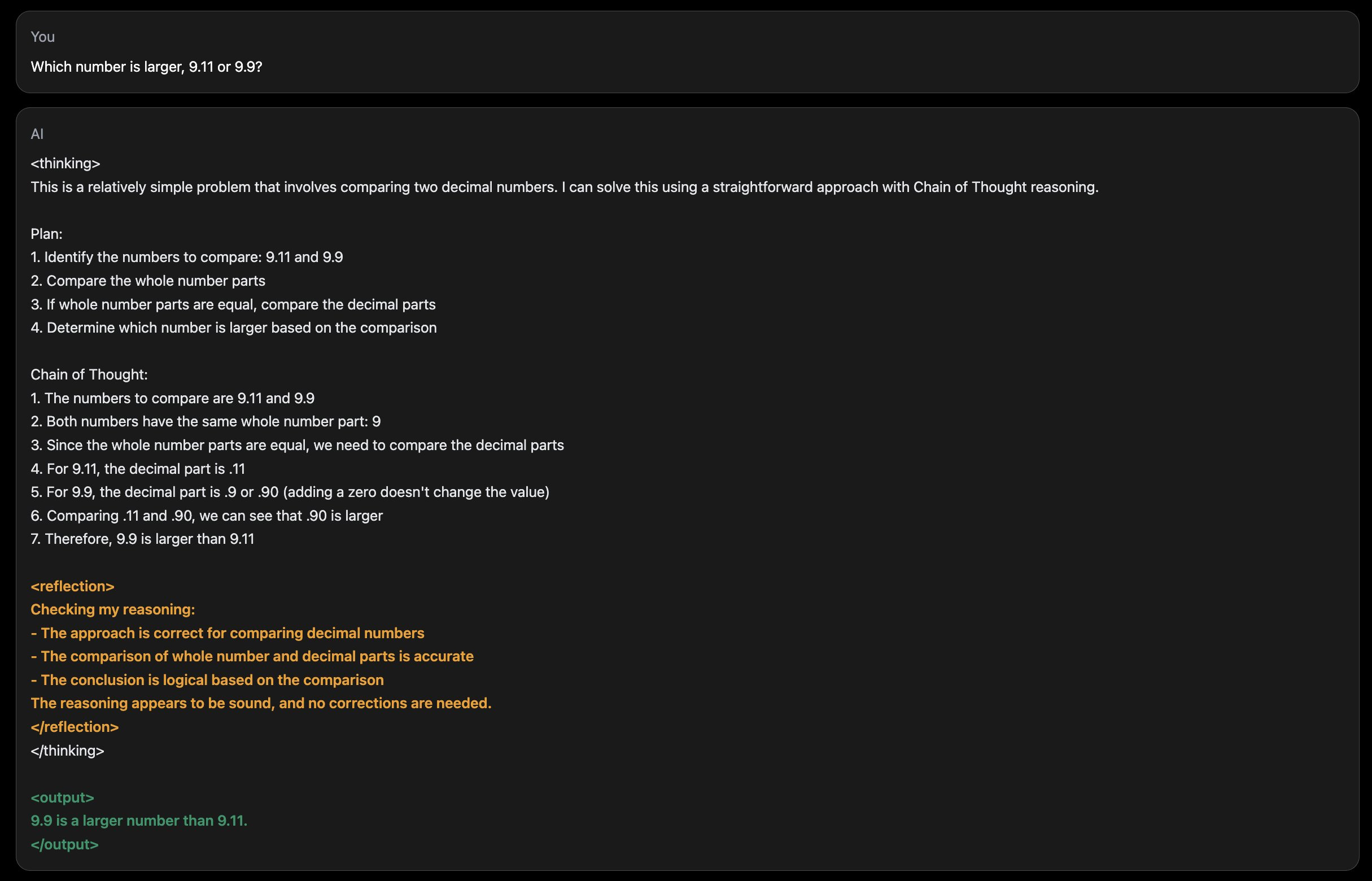 What's new is, this is now happening inside the models head, you don't have to reprompt, you don't even have to know about these techniques! So what you see above, is just colored differently, but all of it, is output by the model without extra prompting by the user or extra tricks in system prompt. the model thinks, plans, does chain of thought, then reviews and reflects, and then gives an answer!